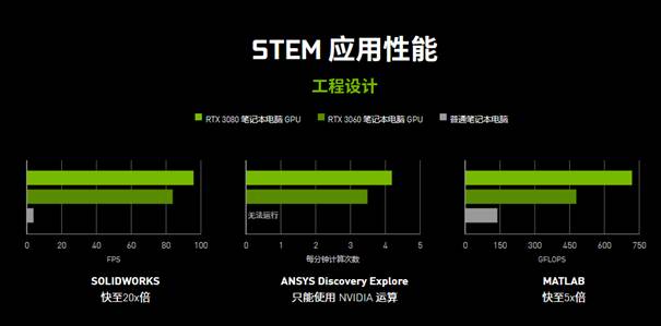 从NVIDIA官方网站上的介绍可以看出,拥有RTX 30系列笔记本电脑GPU的高性能游戏本在科学计算中至高能比CPU运算速度快20倍,在ANSYS Discovery Explore中甚至只支持NVIDIA的GPU渲染,可见RTX GPU在工程设计中的地位是非常之高的。