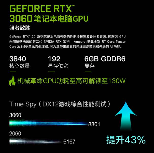 GeForce RTX 3060笔记本电脑GPU拥有多达3840个安培架构的CUDA处理器,192bit位宽6GB容量高速GDDR6显存,不管是游戏还是3D加速或者AI运算,都能提供出色的效率。结合Dynamic Boost 2.0技术能将GPU功耗解锁至130瓦的高水准,在性能发挥上更加淋漓尽致。