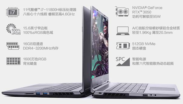 机械革命Z3 Air游戏本搭载了INTEL最新TigerLake-H45架构的第十一代酷睿i7-11800H处理器,并使用了先进的10nm制程工艺,可以在八核心十六线程的规格实现最大睿频4.6GHz的水平。配合16GB大容量双通道DDR4-3200高频率内存和512GB海量NVMe协议固态硬盘,玩家在日常使用中能体验到出色的响应速度。
