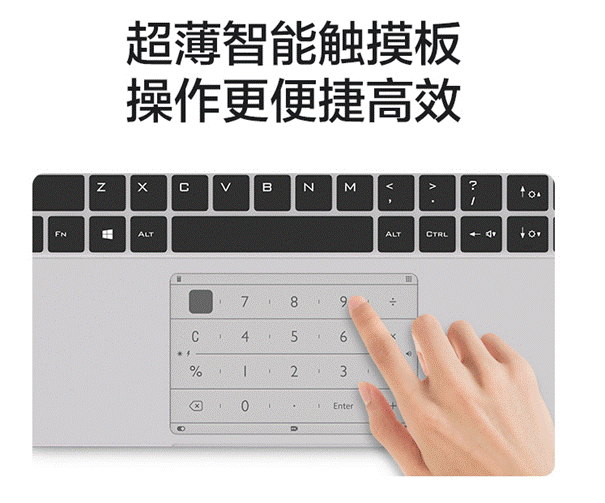 此外机械革命S5轻薄本还采用了智能触控板,除了传统的多点手势操作外还能实现模拟数字键盘的功能和自定义启动程序功能,边缘处也具备了亮度调节、音量调节和视频快进等贴心功能,让用户在日常使用时能够带来更便利的体验。
