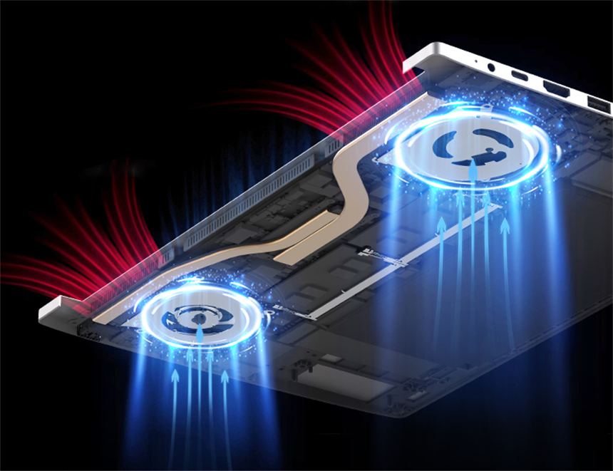 无界14轻薄本性能强大不仅仅是采用了游戏本中的标压处理器,散热能力对性能释放同样非常重要。其搭载了双风扇双热管的强劲智能散热模组,保证低温的同时具备了更低的噪音,让性能持久以50瓦以上功耗进行释放。