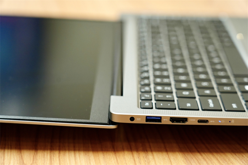 清华同方然14轻薄本接口位于机身两侧,包含:USB 2.0、USB 3.1 x2、HDMI、全功能Type-C以及耳麦,日常办公足够。