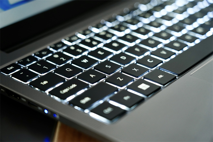 大尺寸键帽便于使用者高强度快速敲击时降低错误率,键程适中有一定确认感。3档羽白色背光均匀不刺眼,满足低光环境的使用需求。开机键在键盘区右上角,形状和触感与其他键盘按键一致。
