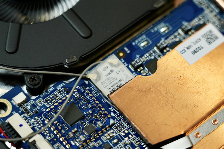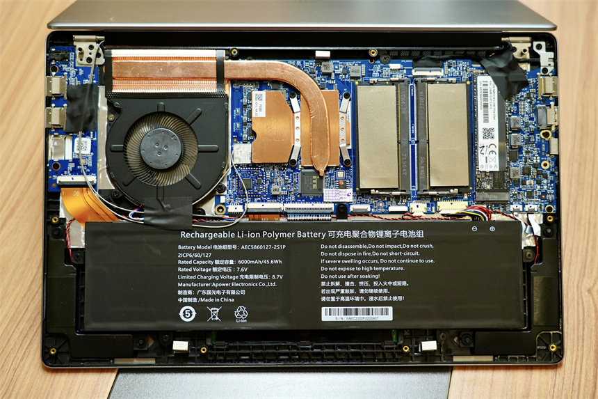 拧下D面所有的螺丝内部被展现出来,布局较为规整,排线接口用绝缘胶布进行加固,防止在剧烈颠簸运输中松脱。CPU及供电区域的热量依靠铜板和L型热管,传导至散热鳍片吹出机身。散热模组看似单薄,应对7nm低电压的AMD R5 5560U轻轻松松。