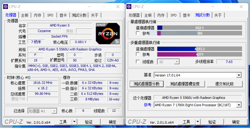 通过CPU-Z来识别锐龙R5 5560U,核心确实是代号Cezanne的ZEN 3构架、7nm制程工艺、6核心12线程、基础频率2.3GHz、睿频4.0GHz。单核心成绩552.1、多核心4223.3,多核倍率7.65,超越昔日桌面主流级王者i7 8700K,逼平8核心16线程的R7 1700X。