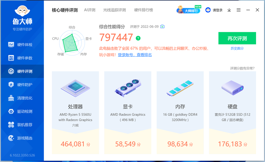 最新版鲁大师,清华同方然14轻薄本总分797447、处理器464081、显卡58549、内存98634、硬盘176183。