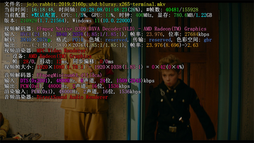 Potoplayer播放一部4K H265电影,清华同方然14轻薄本CPU占用率仅5%,GPU占用率仅13%,可见Vega架构核心显卡在硬解方面很出色。