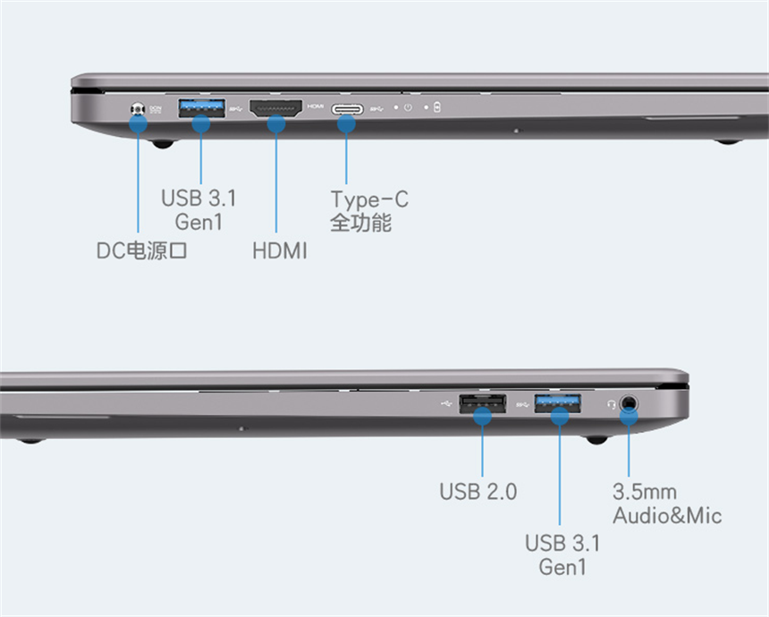 机身接口上,清华同方也充分考虑到现代用户的需求,提供了大量实用接口,有:DC电源接口、USB3.1 Gen1 Type-A接口x2、HDMI接口、具备DP视频输出和PD充电的全功能USB3.1 Type-C接口、USB 2.0 Type-A接口以及3.5mm音频输入输出接口。