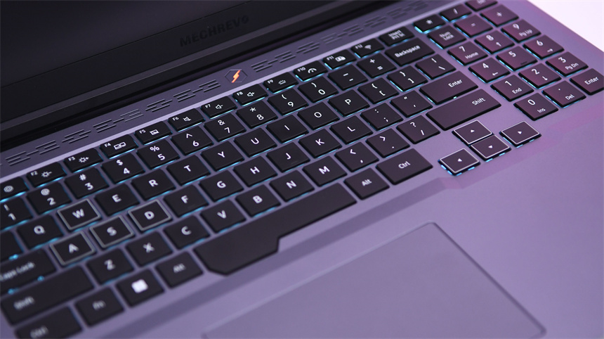 机械革命蛟龙16游戏本为全尺寸键盘并支持1680万色的RGB背光,空格键还是异形结构,左手大拇指能更轻松的按压。