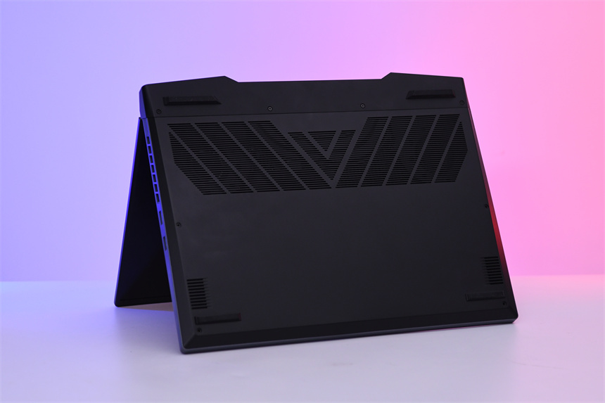本人第一眼看到蛟龙16的背面乍以为也是金属材质,自己观察后发现是塑料,只不过通过高质感的表面工艺,将塑料做成了金属质感。为了实现更高效的散热蛟龙16游戏本D壳上还具备了大量的散热开孔便于冷空气进入机身内部。