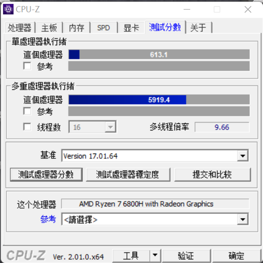通过CPUZ的BENCHMARK可以看出6800H单核心有613.1分,多核心5919.4分,多线程倍率为9.66倍。