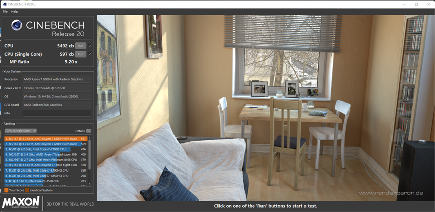 接下来是CINEBENCH R20,这个项目负载比较高,能更好的反映出处理器性能。锐龙7 6800H单核心597cb,多核心5492cb,多线程倍率9.20x。