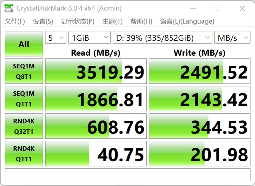 通过CDM对蛟龙16游戏本内置的固态硬盘测试可以看出顺序读写有3519.29MB/S和2491.52MB/S,4K性能的表现也非常出色。