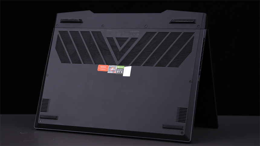 蛟龙16游戏本D面出奇的平整,四块橡胶材质的脚垫不仅能够牢牢将整机固定在桌面,还能配合大面积的镂空开孔让冷空气更轻松进入机身内部协助散热。