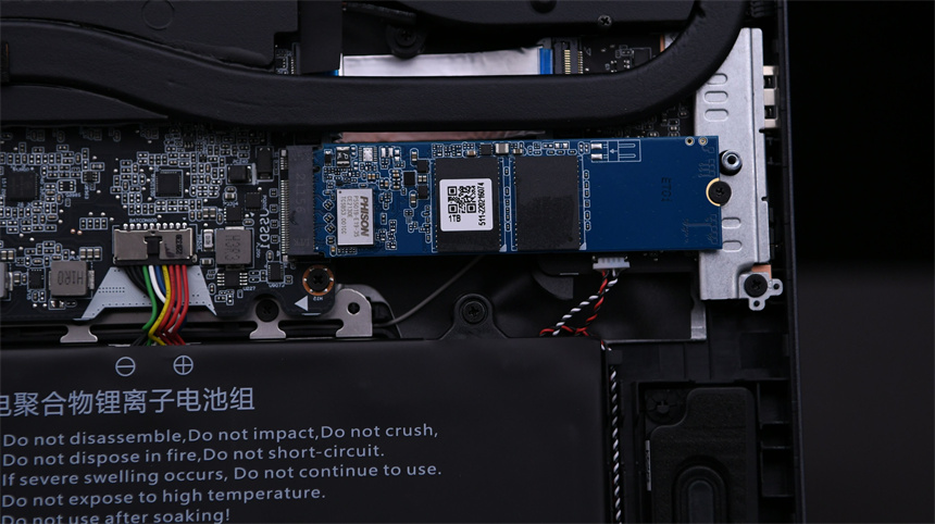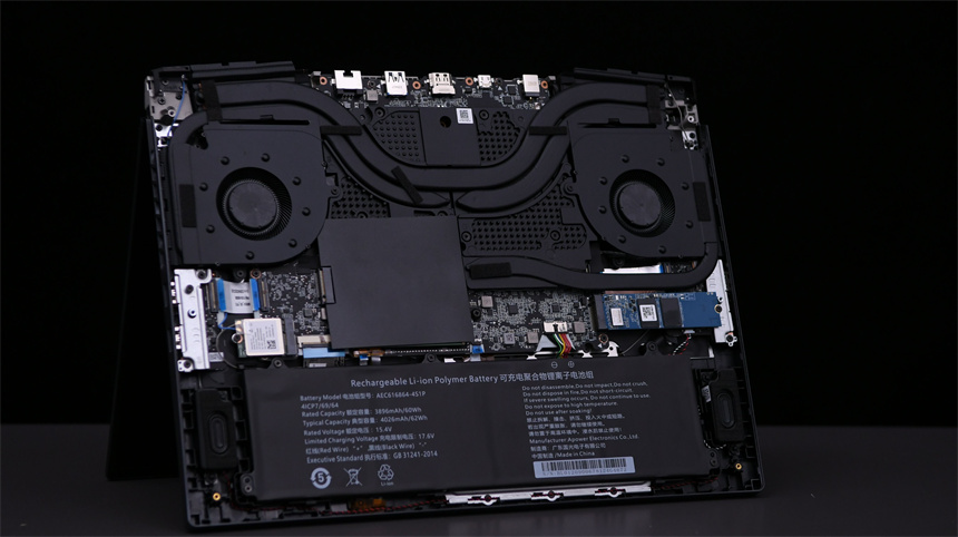 蛟龙16游戏本内部做工非常出色,整体经过了黑化处理,就连内存上也覆盖有黑色屏蔽贴纸来提升稳定性。双风扇四出风口的散热模组格外引人注目,正面四条大尺寸热管贯穿超大面积的均热板,还有一条隐藏在均热板下面的热管专门为显存进行散热。