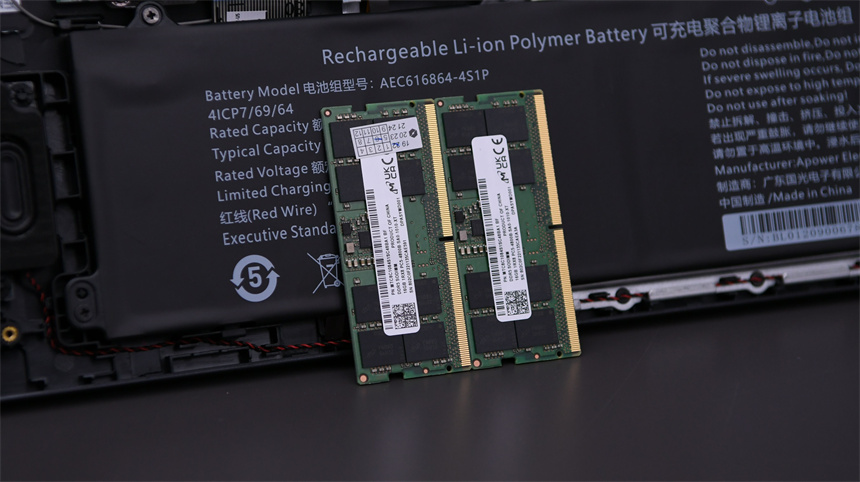 内存条来自镁光,两条DDR5-4800 16GB组成了双通道32GB的超大容量。