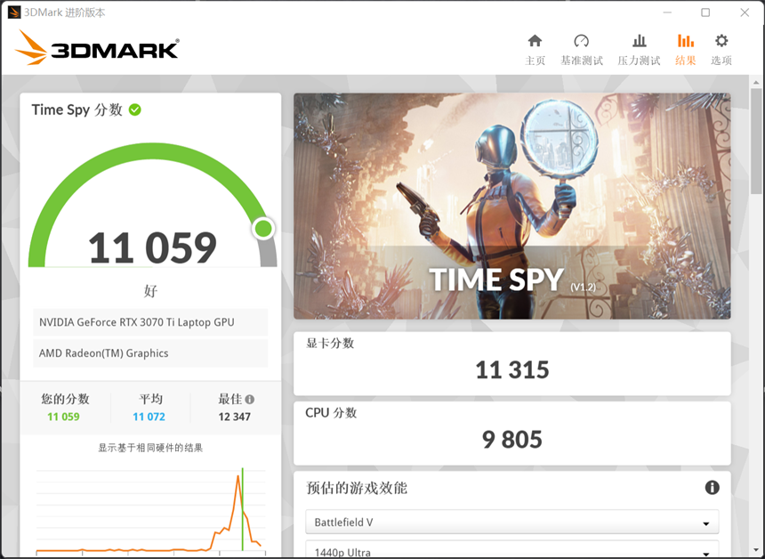 因为蛟龙16游戏本的屏幕分辨率高达2560x1600且采用了旗舰级笔记本电脑GPU,因此本人直接跳过了DX11的Fire Strike系列项目,直接使用DX12 1440P分辨率的Time Spy进行测试。蛟龙16总分达到了11059分,其中显卡分数11315分,CPU分数9805分。