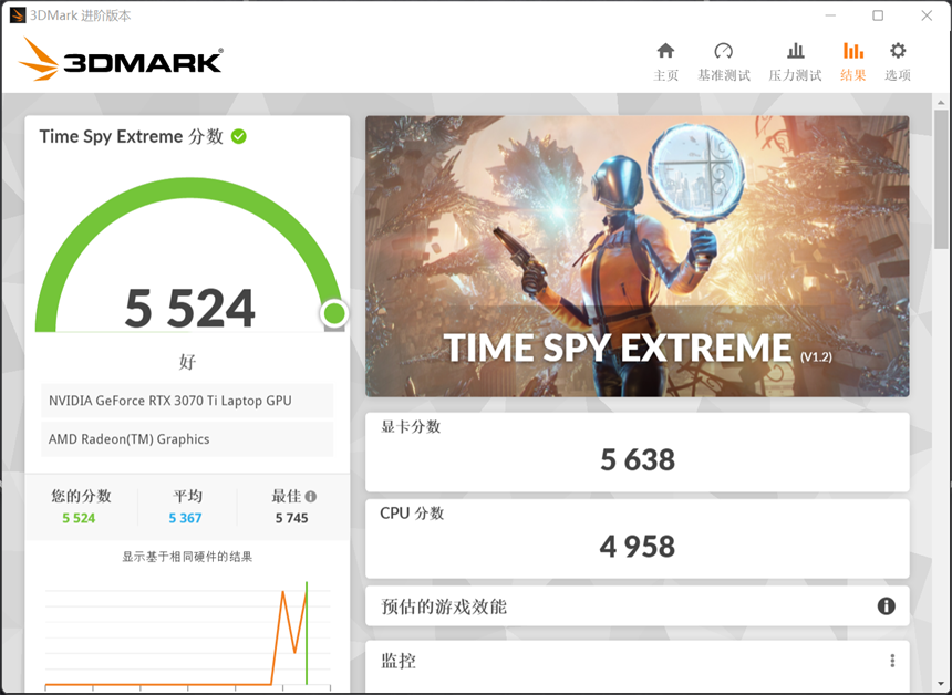 在分辨率达到4K的Time Spy项目中,蛟龙16游戏本总分5524分,显卡分数5638分,CPU分数4958分。