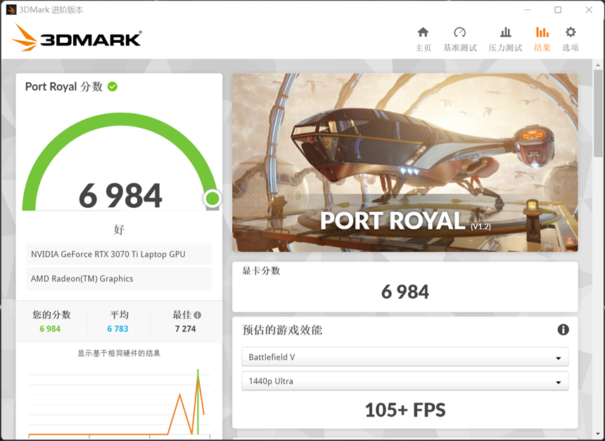 在用于测试实时光线追踪性能的Port Royal中,蛟龙16拿到了6984分。