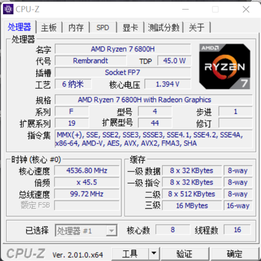 CPUZ的BENCHMARK中锐龙7 6800H处理器单线程609分,多线程5986分,多线程倍率9.83倍。