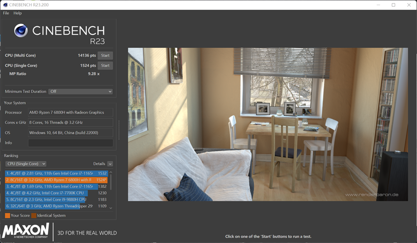 CINEBENCH R23项目上,单线程1524pts,多线程14136pts,多线程倍率9.28x。