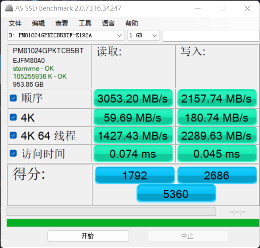 通过AS SSD测试可以看出蛟龙16游戏本中使用的群联固态硬盘在性能表现上非常出色,总分达到了5360分,顺序读写也高达3053MB/S和2157MB/S,性能表现属于PCIE3.0 X4通道产品中的高水准。
