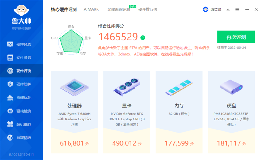 使用新版鲁大师对蛟龙16游戏本进行整机性能测试可以得到1465529分的总成绩,显示击败了全国97%的用户。其中处理器616801分,显卡490012分,内存177599分,硬盘181117分。