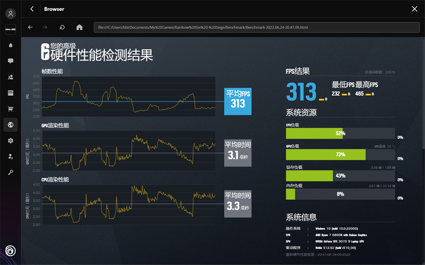 硬核电竞FPS游戏《彩虹六号:围攻》上蛟龙16游戏本在分辨率为2560x1600且特效全开的情况下实现了313FPS的平均帧数,测试全程非常丝滑。