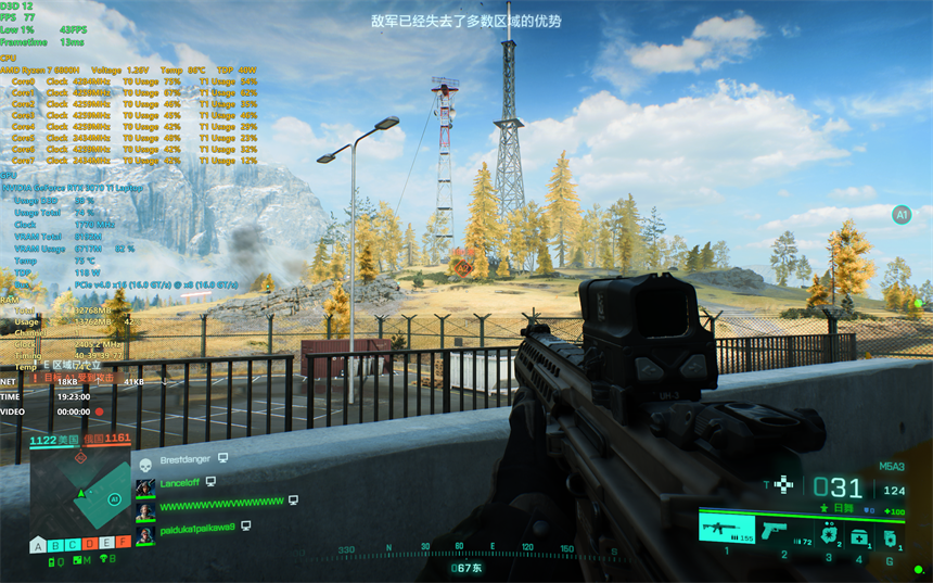 然后在争议很大的一款3A大作《战地2042》上,分辨率2560x1600特效全开且DLSS性能模式的情况下蛟龙16的帧数在80FPS左右,也能有不错的体验。