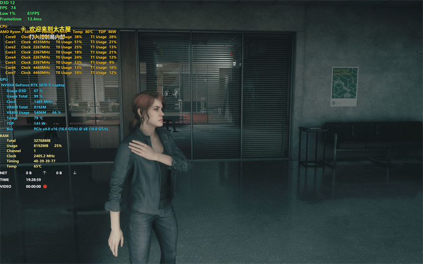 应用大量RTX反射技术的《控制》上,2560x1600分辨率特效全开并且将DLSS开启至性能模式后,蛟龙16游戏本的帧数在70至90FPS间。