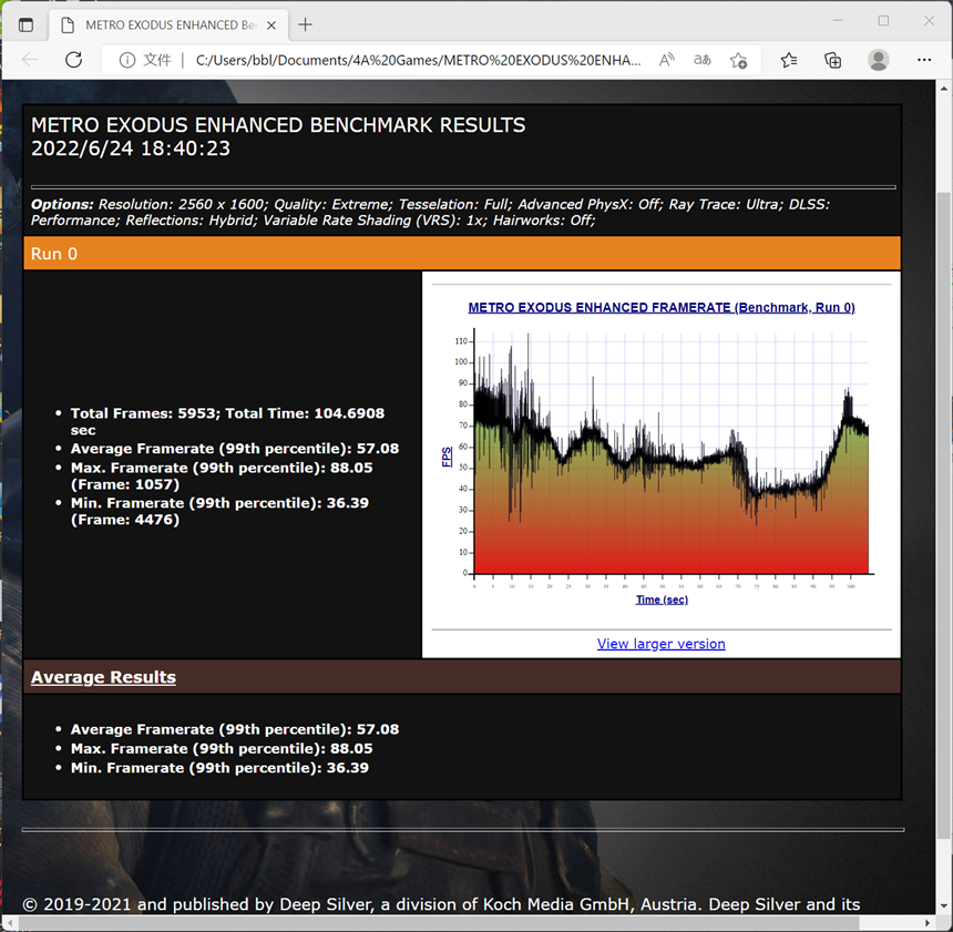 有着新一代显卡杀手之称的《地铁:离去》增强版使用2560x1600分辨率画质调整为Extreme,DLSS为性能模式时平均帧率为57.08FPS。