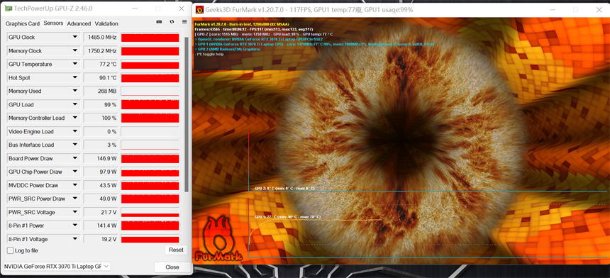 机械革命蛟龙16游戏本中所搭载的这颗GeForce RTX 3070 Ti笔记本电脑GPU是150瓦的满功耗版本,通过Furmark烤机可以看出运行功率在150瓦,GPU核心温度为77.2摄氏度。