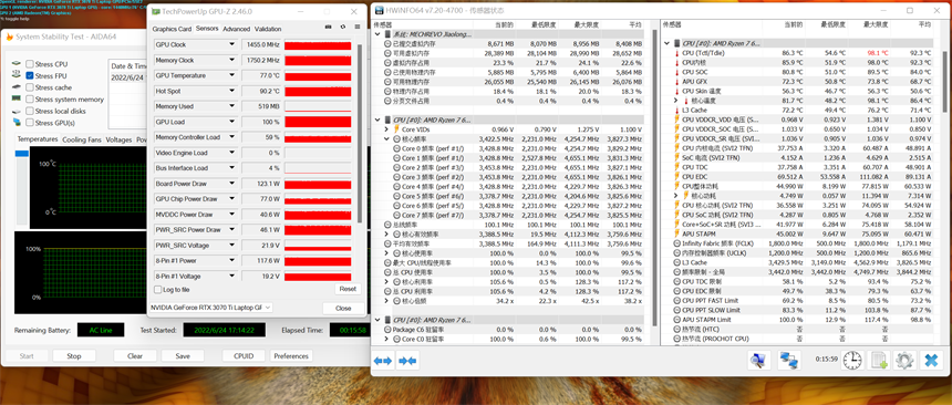 在更加严酷的双烤测试中,GeForce RTX 3070 Ti笔记本电脑GPU功耗稳定在125瓦,核心温度77摄氏度,锐龙7 6800H功耗45瓦,温度86.3摄氏度。