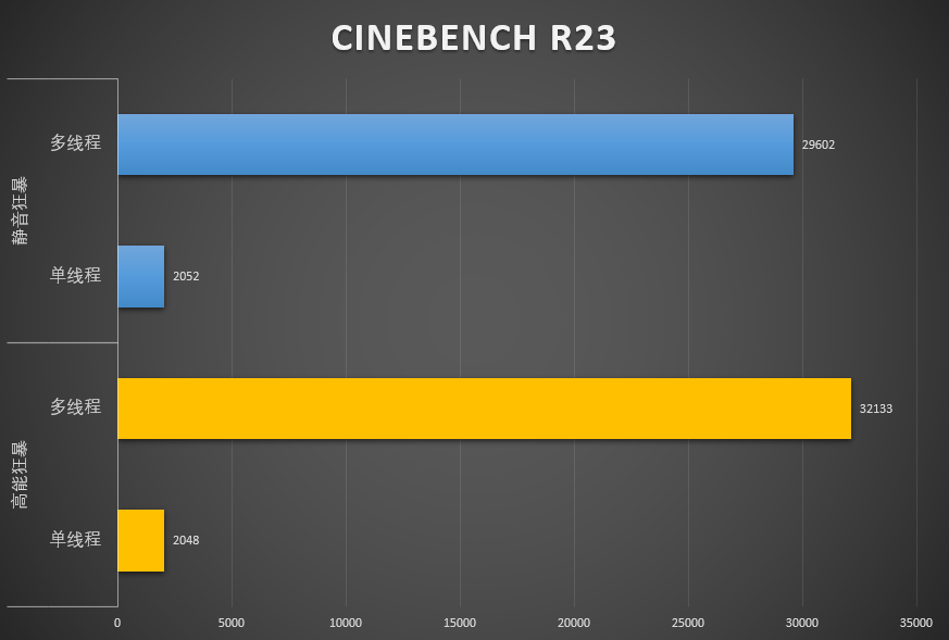 通过CINEBENCH R23对机械革命耀世16 Ultra的处理性能进行测试,使用高能狂暴模式时单线程分数2048pts,多线程32133pts。当切换到噪音只有40分贝的静音狂暴模式后单线程2052pts,多线程29602pts。静音狂暴对比高能狂暴只在多线程性能下损失不到8%,但是噪音和发热下降却非常明显!