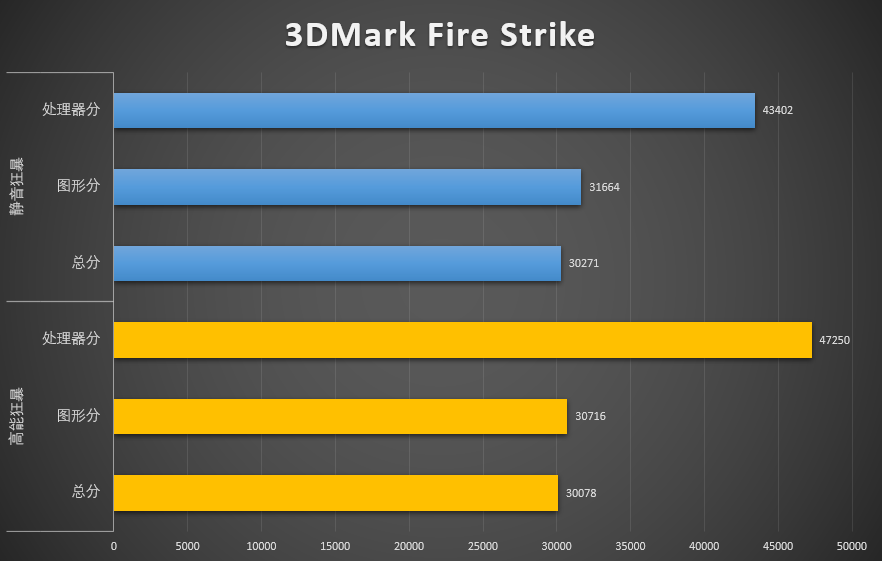 在3D Mark的Fire Strike项目中,使用高能狂暴模式时耀世16 Ultra总分为30078分,其中显卡分数30716分,处理器分数47250分。当切换到静音狂暴模式后,总分为30271分,其中显卡分数31664分,处理器分数43402分。让小编万万没想到是,静音狂暴模式下除了处理器分外居然总分和显卡分都要更高一些!