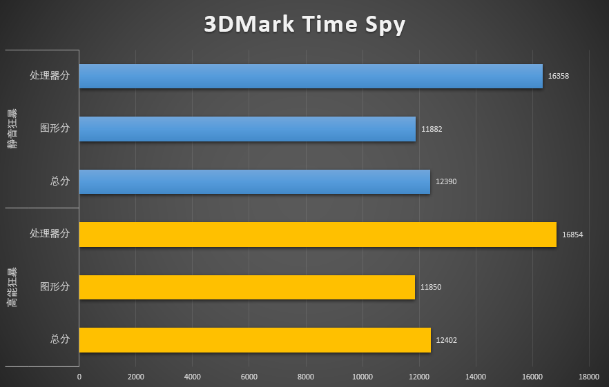 下面来到Time Spy项目,高能狂暴模式总分为12402分,其中显卡分数11850分,处理器分数16854分。切换为静音狂暴模式后总分12390分,显卡11882分,处理器分数16358分。静音狂暴对比高能狂暴时不管是总分还是各子项目分数都和高能狂暴相差无几,显卡分数甚至能实现反超!
