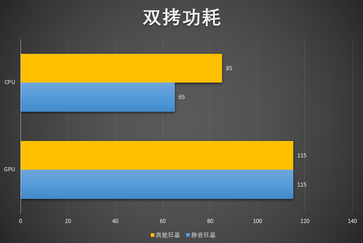 双拷测试中,高能狂暴模式酷睿Ultra 255HX功耗达到了85瓦,RTX5060显卡功耗也跑满了115瓦,总功耗达到了200瓦。切换到静音狂暴模式后,CPU功耗降低20瓦,至65瓦,显卡维持115瓦不变。