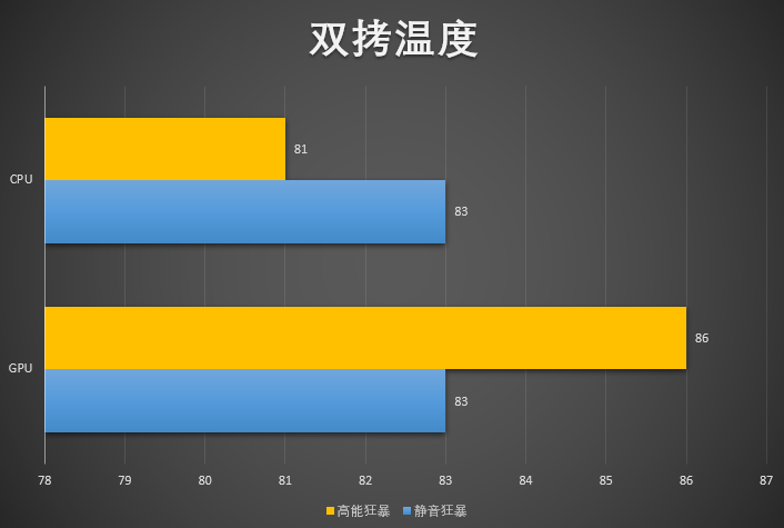 在使用高能狂暴模式双拷时CPU温度为81摄氏度,显卡温度86摄氏度。当切换至静音狂暴后,CPU温度83摄氏度,显卡83摄氏度,虽然风扇转速下降了,但温度却没有明显的提升。
